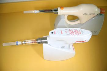 電動の麻酔器は麻酔液を注射する速度や量をゆっくりと一定に正確にコンピュータ制御します。