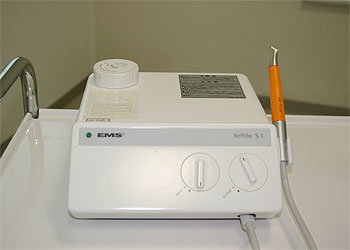 水と超微細なパウダーをエアーで吹き付けて歯の表面の汚れを取り除く、歯面清掃機です。