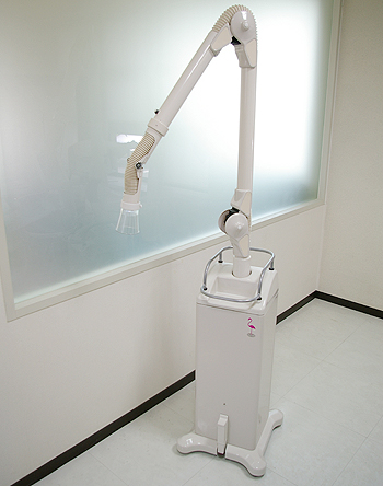 口腔外バキュームは歯科治療中に出る歯の削りカスや修復物の金属片、また患者さんの血液や唾液など細菌汚染物質となるものを確実に素早く吸引して院内感染を防ぎます。